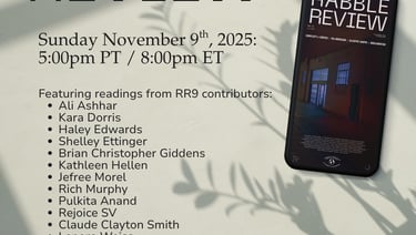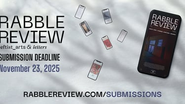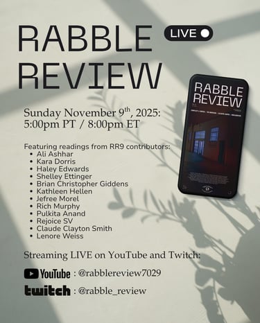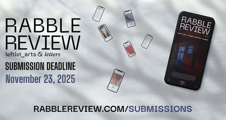 RABBLE REVIEW LIVE returns on November 9th! The livestream will feature pre-recorded readings from contributors from RABBLE REVIEW No.9. After the readings, the editorial team will dig in to the new issue to share behind the scenes insights and more.