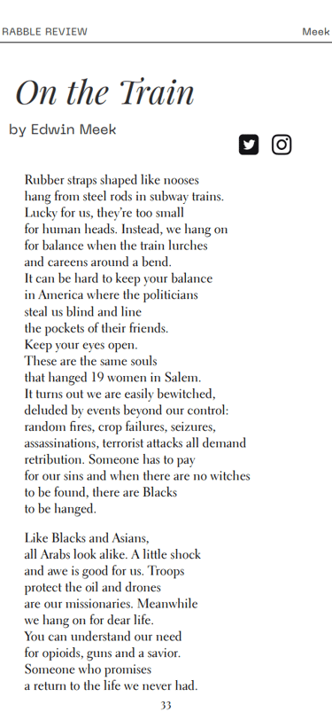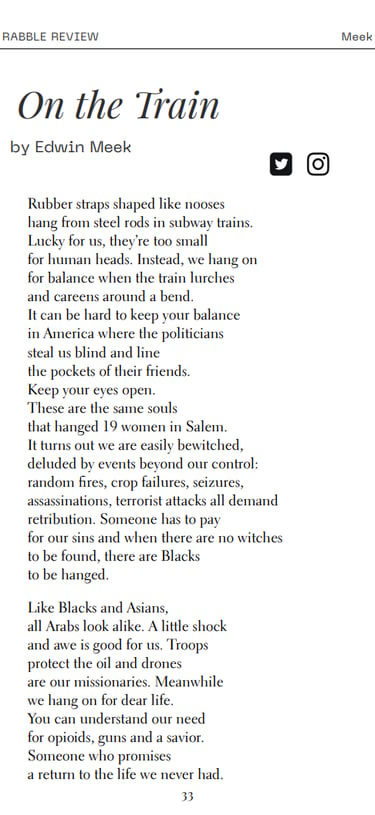 This week our featured work comes from our fifth issue. Edwin Meek's poem ponders the history of the US, and what exactly we're fighting to recapture. It is yet another poem we were proud to publish that is locked in time, and in constant conversation with the present moment. Read it now at the links below and check out the other works in RABBLE REIEW No.5.
