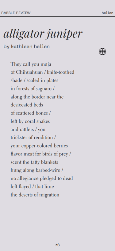 This week we're continuing to highlight works from, RABBLE REVIEW No.9, our most recent issue. The featured work this week is the textured and layered, "alligator juniper," by kathleen hellen. It will be featured through the rest of the week. Read that and other wonderful works in RABBLE REVIEW No.9.